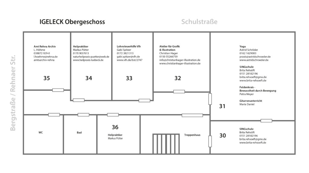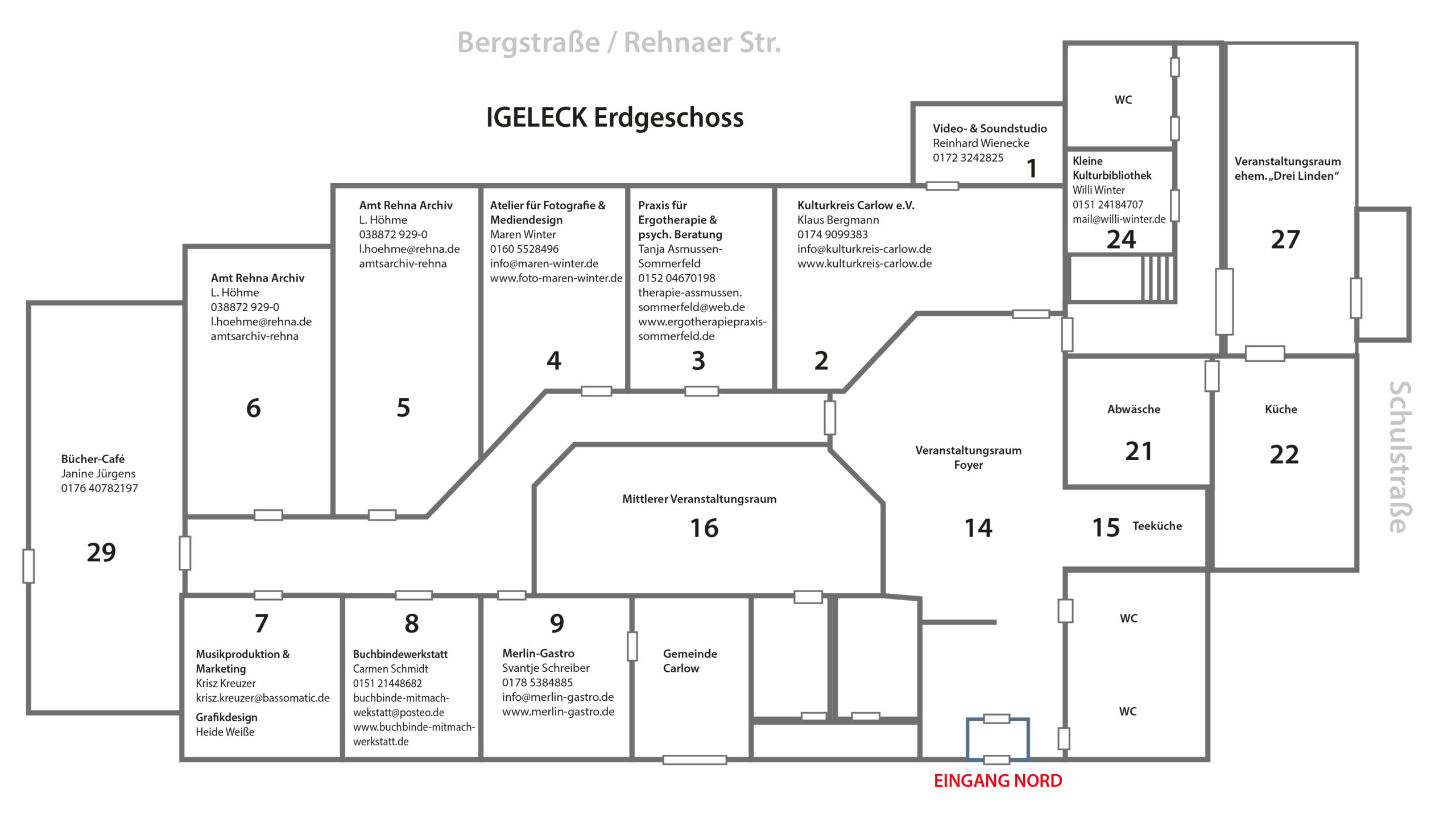 Der Eingang zu allen Nutzerinnen und Nutzern befindet sich an der Nordseite des Gebäudes, also „hinten“ und auf dem Plan unten. Von der Bergstraße/ Rehnaer Straße in die Schulstraße einbiegen, dann ist das Straßenschild „Igel-Eck“ direkt zu sehen. Es gibt nur die Hausnummer 1.